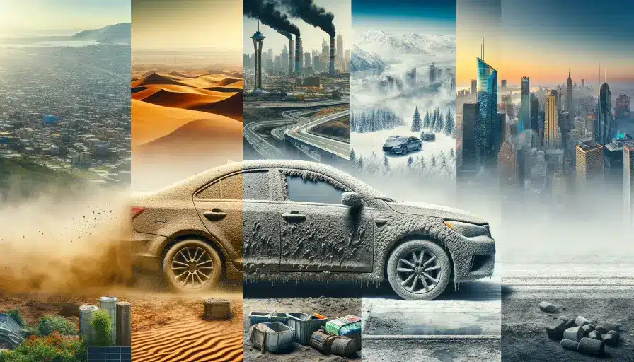 En zonas de clima árido, los coches se enfrentan a una constante invasión de polvo y arena. Este fenómeno es particularmente visible en regiones del Medio Oriente y áreas desérticas de África y América.